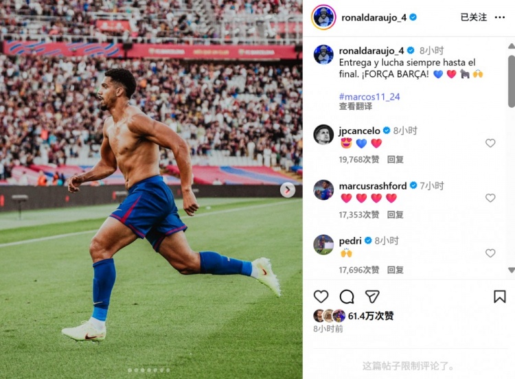 赛后阿劳霍也在社媒晒出进球后脱衣庆祝的像片,配文写说念:“历久拼尽全力并坚抓到终末一刻,加油巴萨!”