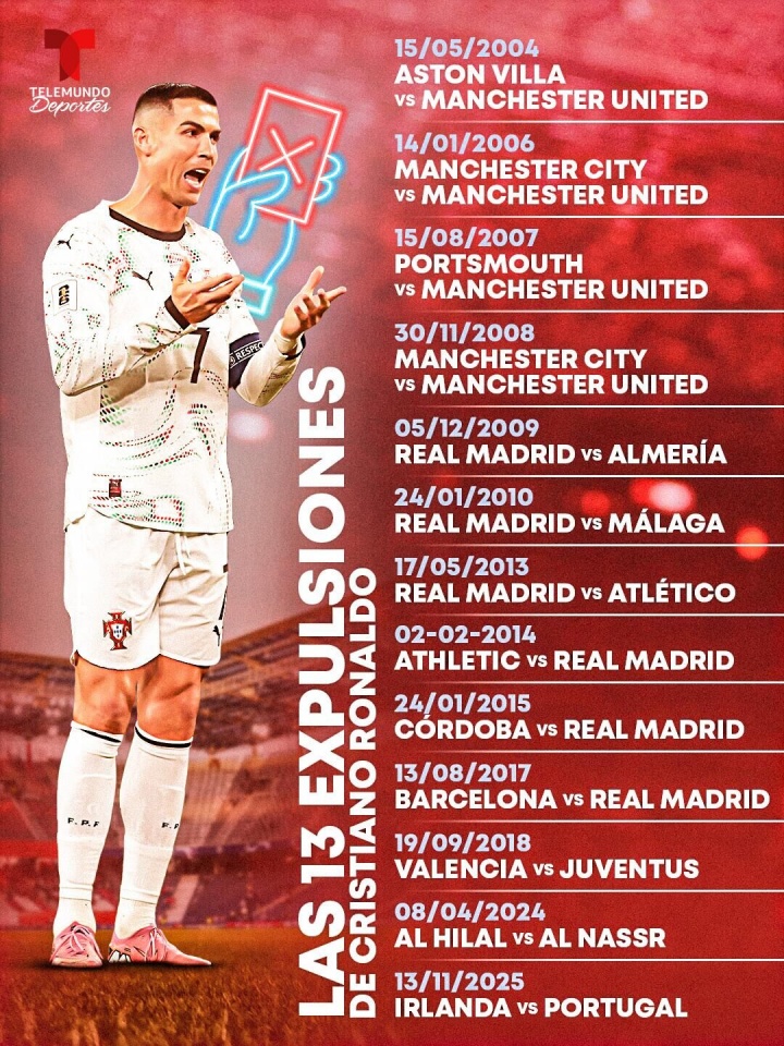 C罗生活13次染红🟥:其中3次肘击,2次挑升踢东谈主,2次触及假摔
