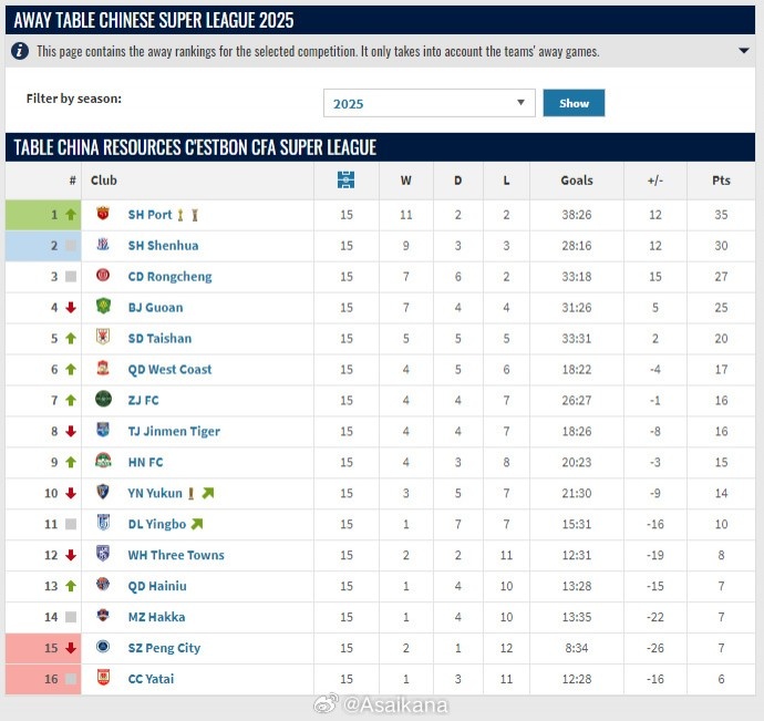 中超兴味积分榜:主场比赛积分榜&客场比赛积分榜