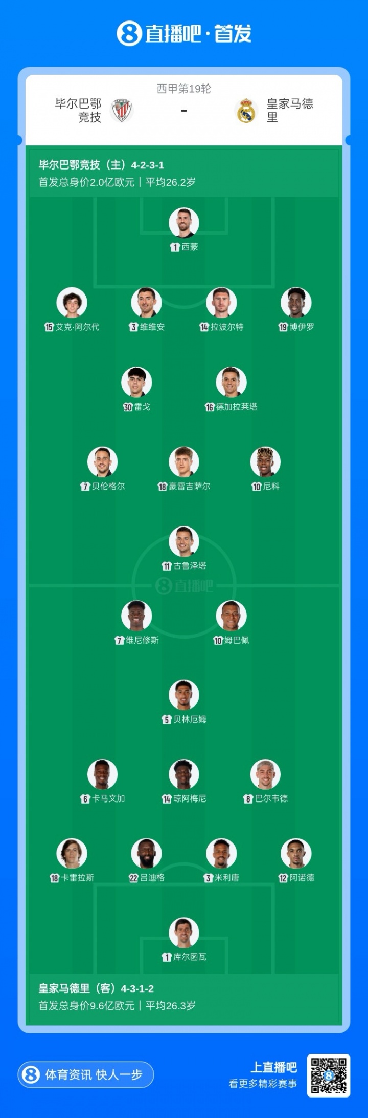 皇马vs毕巴首发:姆巴佩、维尼修斯、卡马文加先发,尼科出战