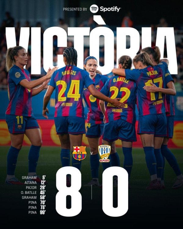 8月31日讯 西甲女足首轮,巴萨女足8-0大捷升班马阿尔哈马,顺利获得开门红。克劳迪娅-皮纳演出帽子戏法,格雷厄姆-汉森梅开二度,此外艾塔娜、帕若尔和奥娜-巴特列也各有斩获。 巴萨女足球员格雷厄姆在开场阶段便首开记载,她用后背将马皮-莱昂的传中球撞上钩窝。良晌之后,这位挪威球员与奥娜-巴特列在右路打出互助,助攻从后排插上的艾塔娜平直推射破门。 比赛进行到半小时,上赛季的最好弓手埃娃-帕若尔也绽开了她的个东说念主进球账户,她收拢阿尔哈马后卫一次突围不实,在禁区内谗谄获得进球,将......查看更多