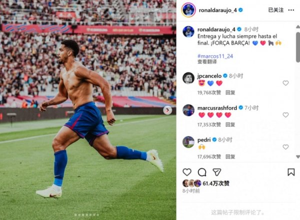 10月19日讯 在本轮西甲,巴萨2-1险胜赫罗纳,阿劳霍替补登场完成补时绝杀。 赛后阿劳霍也在社媒晒出进球后脱衣庆祝的像片,配文写说念:“历久拼尽全力并坚抓到终末一刻,加油巴萨!”......查看更多