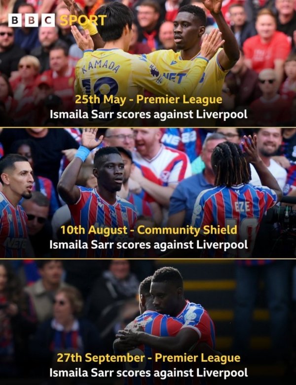 赤军苦主,水晶宫时尚萨尔聚合3次靠近利物浦均破门