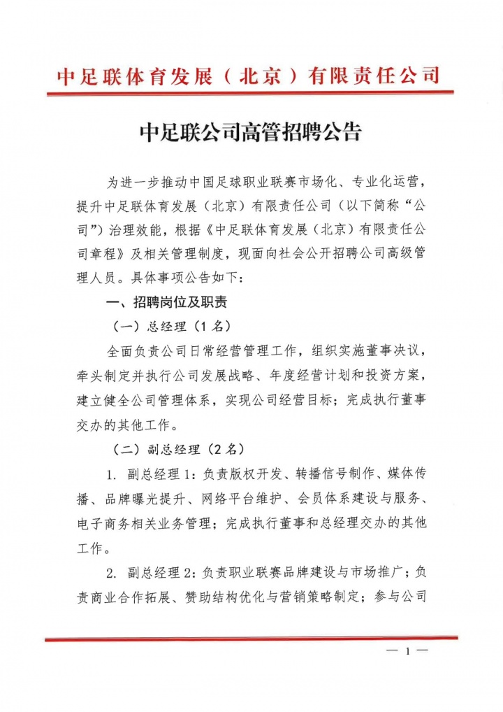 10月09日讯 中国足球做事联赛齐集会发布高管招聘公告,招聘岗亭为总司理(1名)、副总司理(2名)。