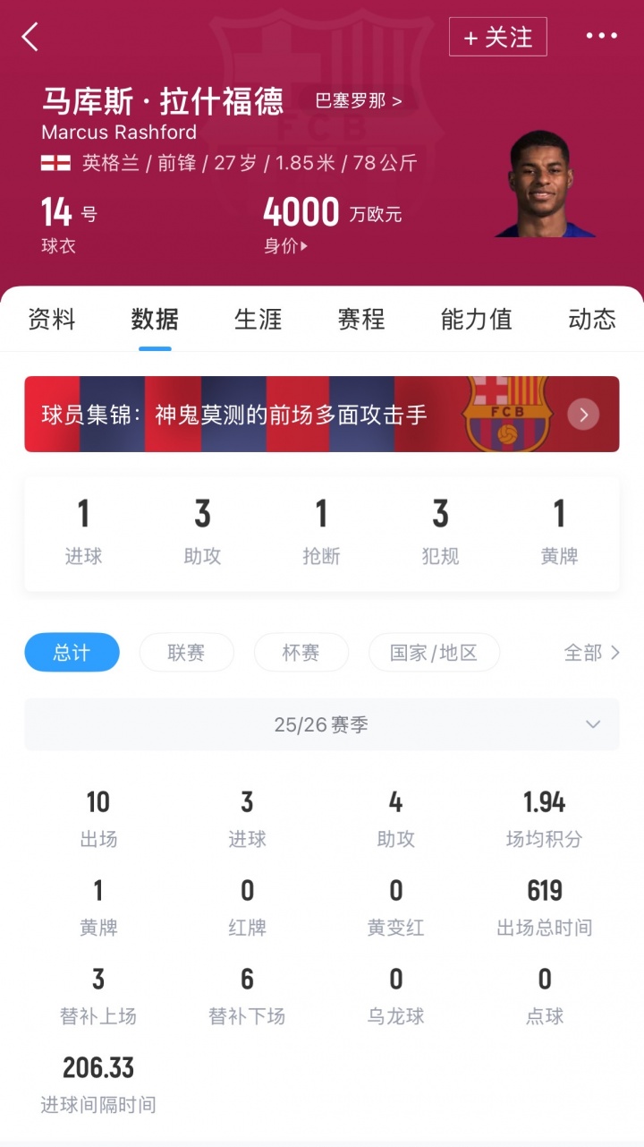 27岁的拉什福德本赛季依然代表巴萨出场10次,孝顺3球4助,当今德回身价4000万欧元。