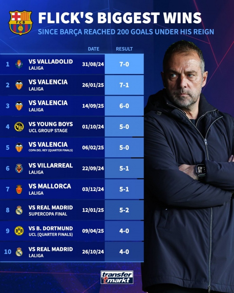 弗里克握教巴萨最大顺利:7-0巴拉多利德居首,5-2、4-0皇马在列