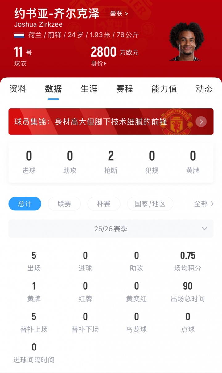 都尔克泽旧年夏窗以4250万欧转会费加盟曼联,本赛季0球0助,当今德回身价2800万欧。