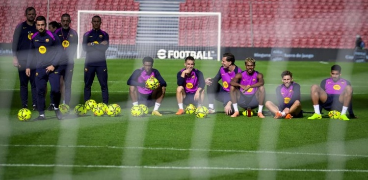 球员们分红三组进行传球老到,之后进行了小场比赛,分为两队:穿绿背心和不穿绿背心,两名中场(德容和奥尔莫)轮流。穿绿背心的一方有:费兰-托雷斯、亚马尔、德罗、库巴西、克里斯滕森、巴尔德、卡萨多和埃斯帕特。不穿绿背心的一方有:阿劳霍、埃里克-加西亚(戴着面具)、拉什福德、托尼、伯纳尔、费尔明、巴德吉、莱万和托伦茨。