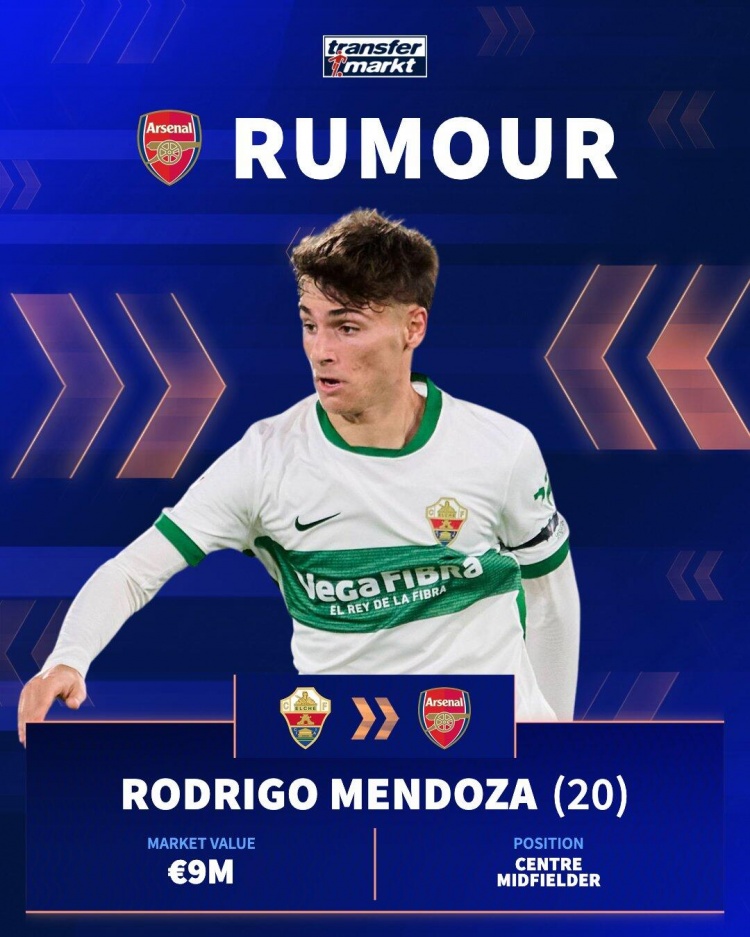 12月1日讯 据罗马诺的报谈,阿森纳在存眷现遵守于西甲埃尔切队的20岁中场球员门多萨(Rodrigo Mendoza)。