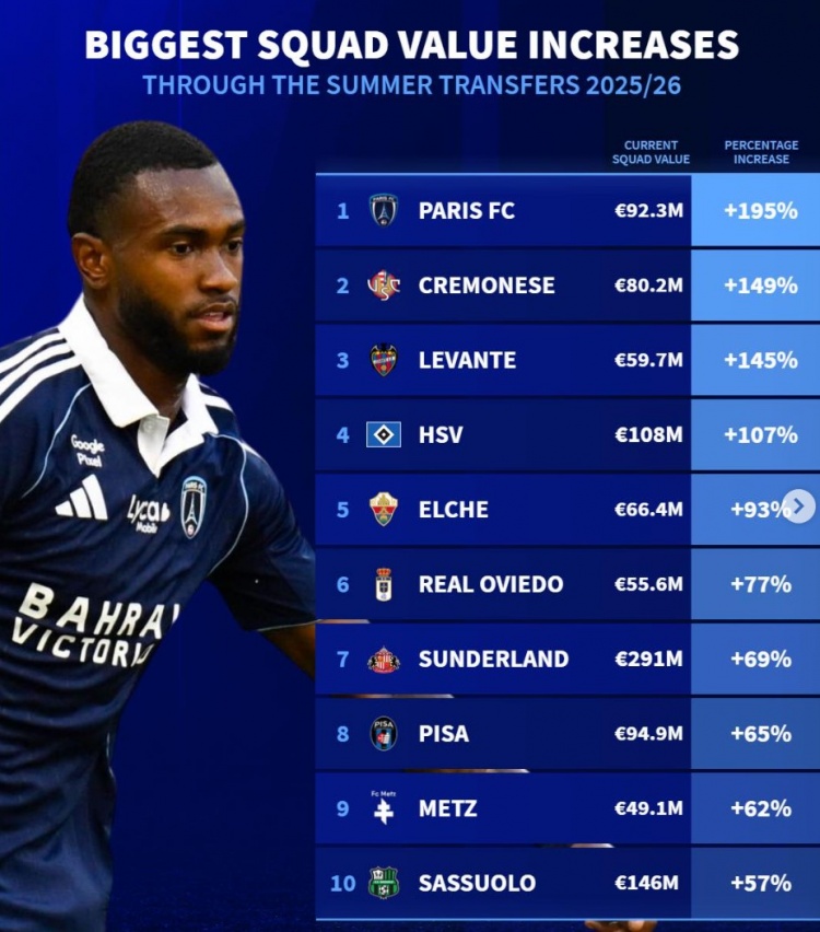 9月7日讯 《转会阛阓》统计了今夏转会窗事后的总身价上升比例情况,多家升班马霸榜。