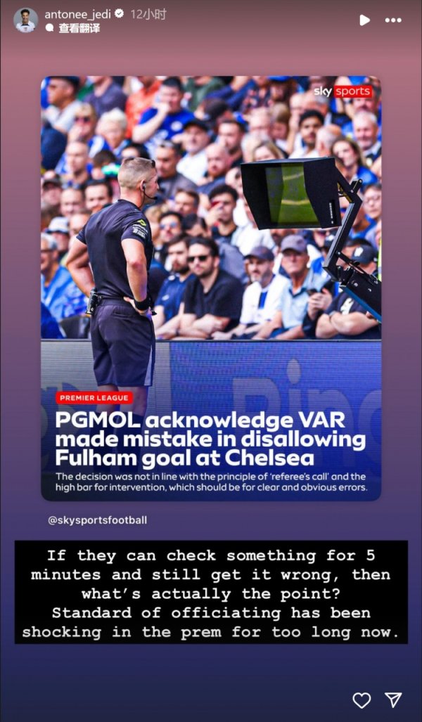 富勒姆球员罗宾逊:看5分钟回放已经判错了,英超裁判水平很灾祸