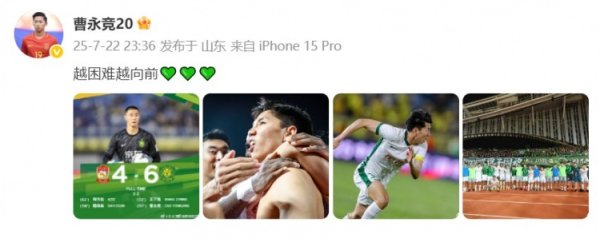 加时赛1v2抽射破门!曹永竞发文:越难题越上前💚💚💚