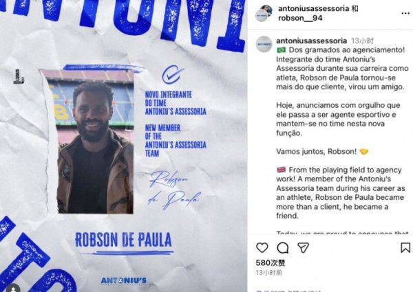 10月31日讯经纪公司Antoniu’s Assessoria当天官方告示,前大连英博外助罗伯森加盟,成为该公司旗下牙东谈主。 该公司公告写谈:“从球员转型到经纪责任!咱们将迎来一位前奇迹足球通顺员罗伯森,他将成为咱们的新伙伴。咱们很运道地告示,他将成为别称体育牙东谈主,以新的身份和咱们一同同事。让咱们全部勤劳,罗伯森!” 罗伯森建立于1994年2月,上赛季遵循于大连英博并得手匡助球队冲超,不外在赛季鸿沟后因合约到期离队,由于伤病原因他缺憾选择退役,大连英博本月主场战武汉三镇......查看更多