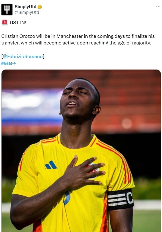 罗马诺:改日几天,哥伦比亚17岁小将奥罗斯科将完成加盟曼联手续