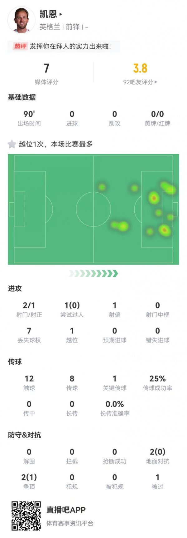 凯恩本场2射1正 1枢纽传球1造良机 4抗拒1得手 获评7.0分