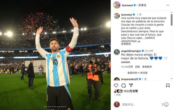 9月7日讯 梅西在Instagram发文谈国度队主场告别战,迪马利亚在沟通区奉上道贺。 梅西写谈:“一个令我愉快到于今仍无法言表的终点夜晚,由衷感谢统共东谈主的认真与永久如一的守旧。不管发生什么,不管将来若何,独一天主判辨……阿根廷加油!” 迪马利亚沟通区写谈:“永远不要停驻脚步,我的一又友,史上最好!”......查看更多