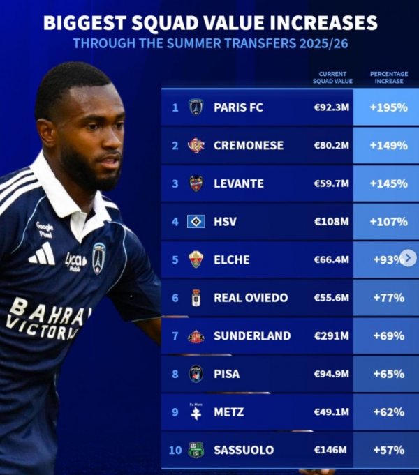 9月7日讯 《转会阛阓》统计了今夏转会窗事后的总身价上升比例情况,多家升班马霸榜。 德转列今夏身价上升比例榜:欧元 1.巴黎FC,9230万,+195% 2.克雷莫内塞,8020万,+149% 3.莱万特,5970万,+145% 4.汉堡,1.08亿,+107% 5.埃尔切,6640万,+93% 6.皇家奥维耶多,5560万,+77% 7.桑德兰,2.91亿,+69% 8.比萨,9490万,+65% 9.梅斯,4910万,+62% 10.萨索洛,1.46亿,+57%......查看更多