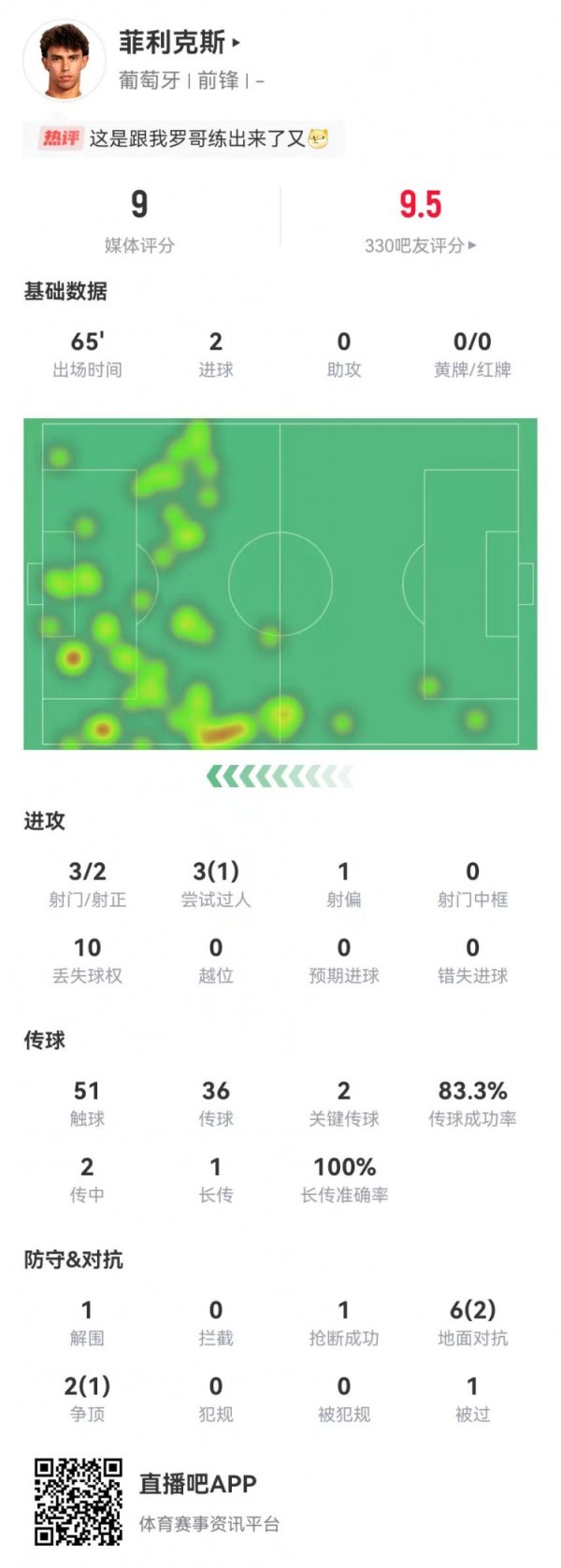 菲利克斯本场3射2正进2球+1造良机2关节传球 8抗击3得胜 获9.0分