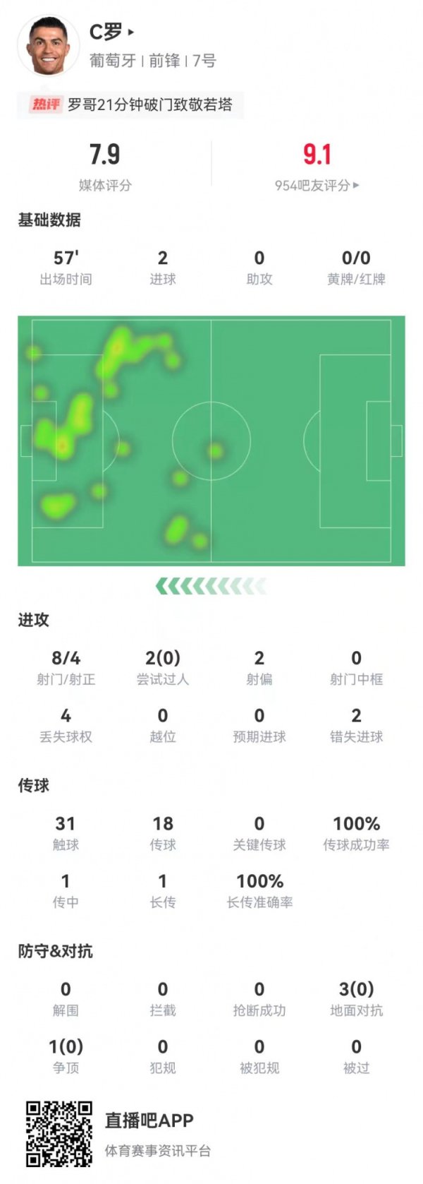 梅开二度!C罗本场8射4正进2球,18传球全成效,获评7.9分