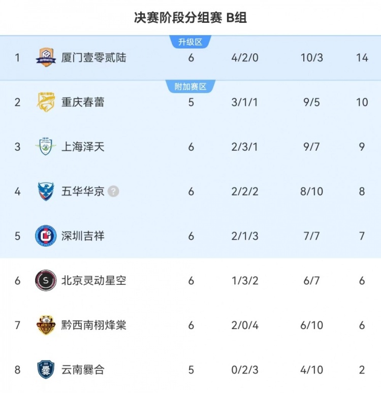 积分榜上,门壹零贰陆以6战4胜2平积14分,名次B组榜首。10月6日晚上,竞争敌手重庆春蕾本轮比赛将在主场对阵云南爨合,如重庆队本场比赛不行取胜,厦门队将凭借对重庆队的赢输干系上风,提前一轮锁定小组第一,获取晋级2026中乙联赛的阅历!