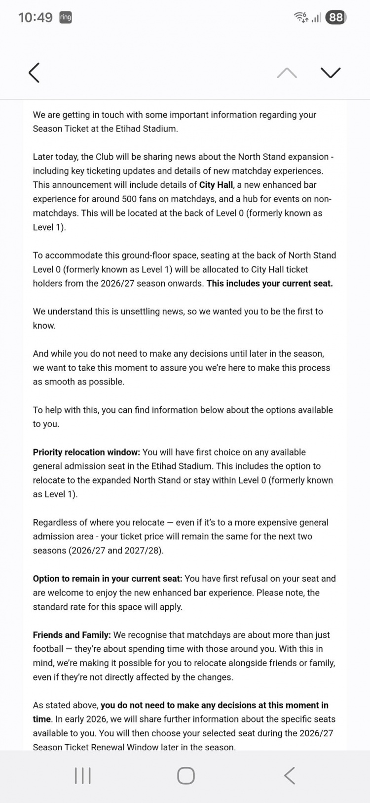 曼城俱乐部已奉告部分季票合手有者,由于北看台扩建打算,他们现时的座位将受到影响。俱乐部将在北看台0层——原1层——后部新建一个名为“市政厅”City Hall的增强型酒吧体验区及行为中心,该区域从2026/27赛季起将分派给新的合手票东谈主,这凯旋影响了收到奉告球迷的现存座位。