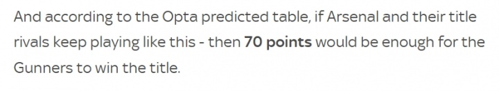 10月31日讯 太空体育援用Opta最新的数据分析指出,笔据现在走势,阿森纳本赛季可能只需要70分即可夺得英超冠军。