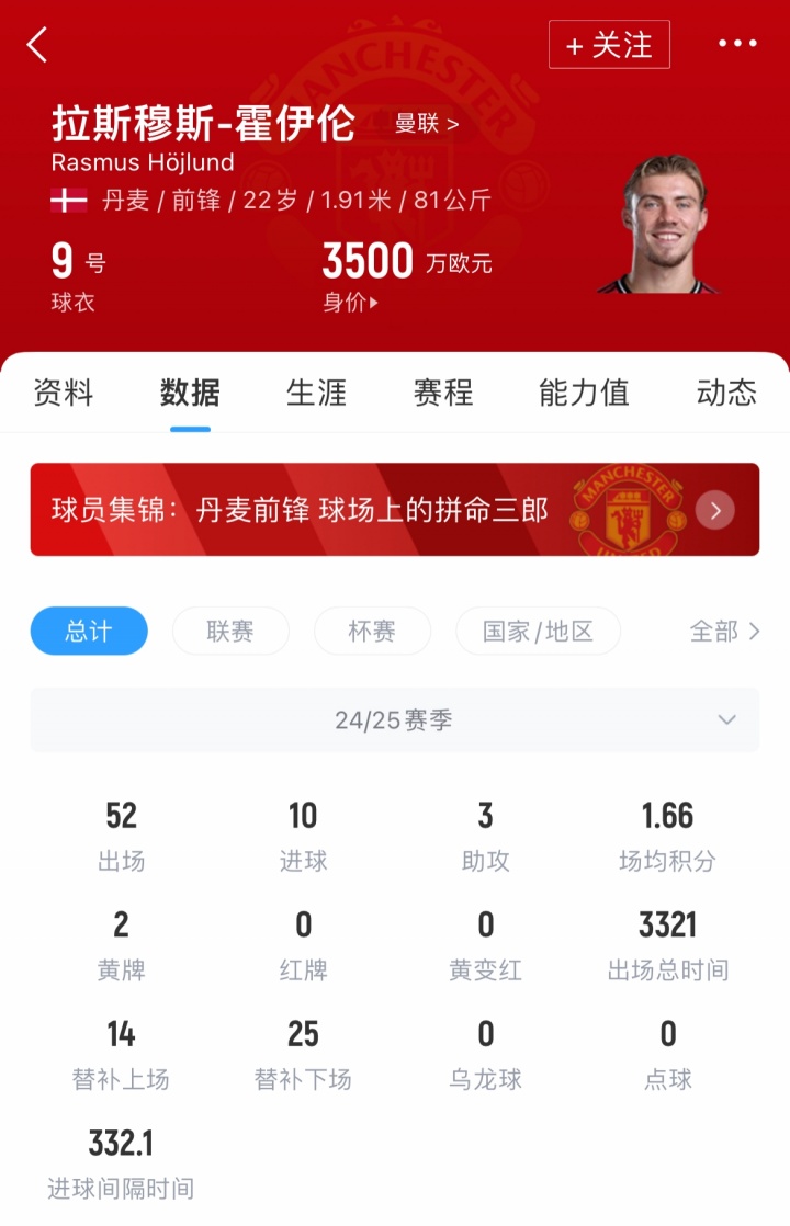 霍伊伦时年22岁,上赛季为曼联出场52场,得回10粒进球和3次助攻,当今其德回身价为3500万欧。