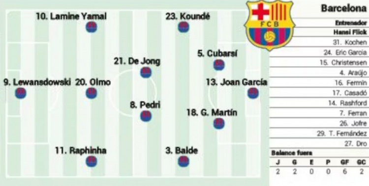 8月31日讯 北京时分周一凌晨的西甲第3轮比赛,巴萨将赶赴客场挑战巴列卡诺。《阿斯报》对本场比赛首发威望进行了意料,库巴西和杰拉德-马丁搭档中卫,莱万、亚马尔和拉菲尼亚构成首要三叉戟,加维缺阵。