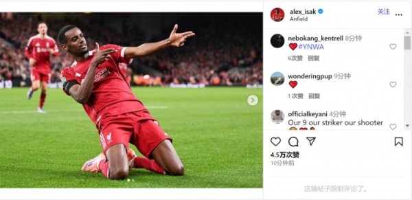 攻入利物浦生活首球!伊萨克社媒晒比赛相片庆祝