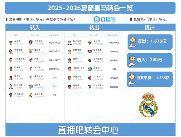 我团弘远新援↓ 1:赫伊森 后卫 6250万欧元 伯恩茅斯→皇马 2:卡雷拉斯 后卫 5000万欧元 本菲卡→皇马 3:马斯坦托诺 时尚 4500万欧元 河床→皇马 4:阿诺德 后卫 1000万欧元 利物浦→皇马......查看更多