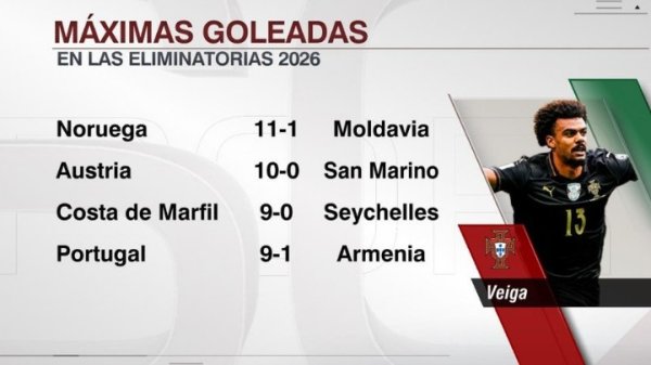 11月17日讯 在本轮世初赛,葡萄牙9-1打败亚好意思尼亚。 这亦然在2026年宇宙杯预选赛第四大分差收效,前三位离别是挪威11-1摩尔多瓦、奥地利10-0圣马力诺、科特迪瓦9-0塞舌尔。......查看更多