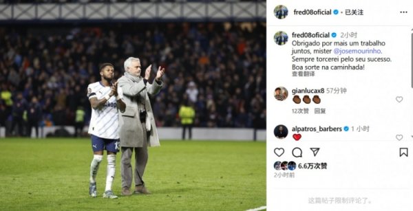 弗雷德告别穆帅:感谢您与我再次并肩战役,我弥远会为您加油