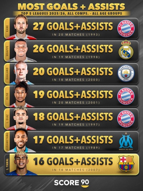 12月2日讯 Score90统计了本赛季五大联赛球员参与进球数目,比肩出榜单,凯恩27球居首。 本赛季五大联赛球员参与进球榜(总计赛事): 凯恩(拜仁)——20场27球 姆巴佩(皇马)——19场26球 哈兰德(曼城)——18场20球 奥利塞(拜仁)——20场19球 迪亚斯(拜仁)——19场18球 奥巴梅扬(马赛)——17场17球 亚马尔(巴萨)——14场16球......查看更多