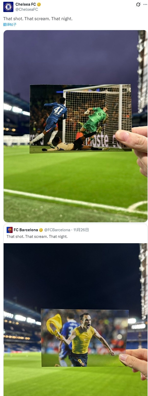 巴萨晒伊涅斯塔绝杀蓝军相片,赛后切尔西以埃斯特旺相片回敬