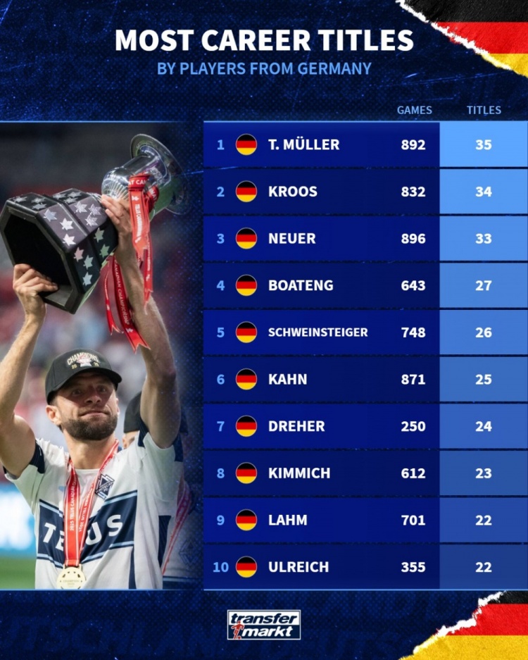 德国球员冠军榜:穆勒35冠居首,克罗斯34冠、诺伊尔33冠