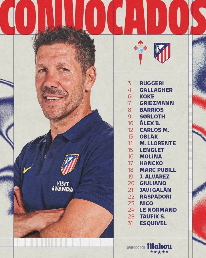马竞对塞尔塔名单:阿尔瓦雷斯、格列兹曼领衔,穆索躯壳不适缺席
