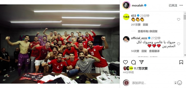 梅开二度!萨拉赫社媒晒全队更衣室合照,庆祝埃及进攻寰宇杯