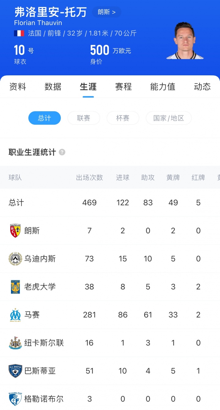托万本次因巴尔科拉受伤而被补招入队,32岁的他当今着力于法甲朗斯,新赛季出场7次打入2球。
