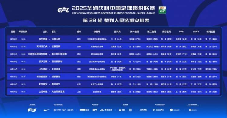 10月24日讯 中超官方公布第28轮裁判安排,乌兹别克斯坦裁判坦塔舍夫端正泰山vs海港,马宁端正国安vs海牛。