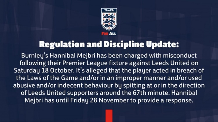 11月11日讯 英足总官方音尘,伯恩利中场汉尼拔·梅布里因在10月18日对阵利兹联的英超比赛中不当行径而被指控。
