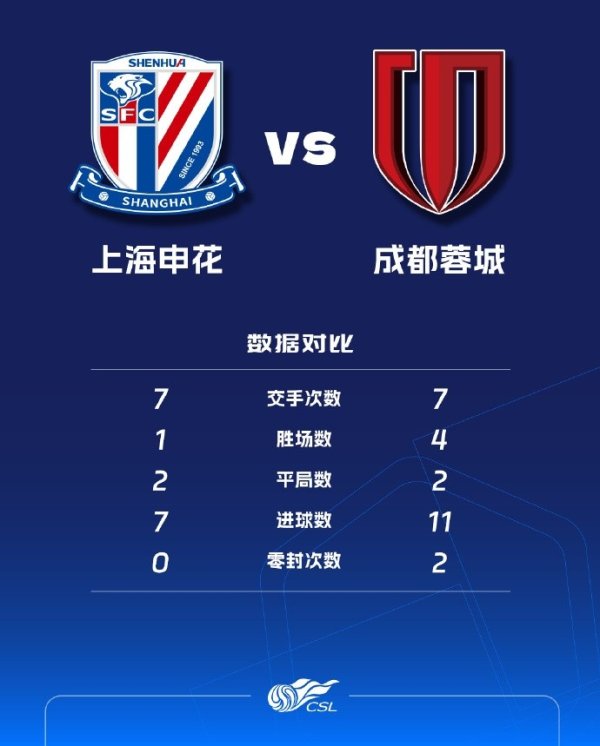 上海申花VS成皆蓉城历史交手7次 蓉城4胜2平1负且2次零封占优势