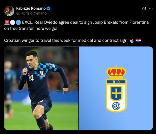 罗马诺:皇家奥维耶多将免签佛罗伦萨时尚布雷卡洛,Here we go!