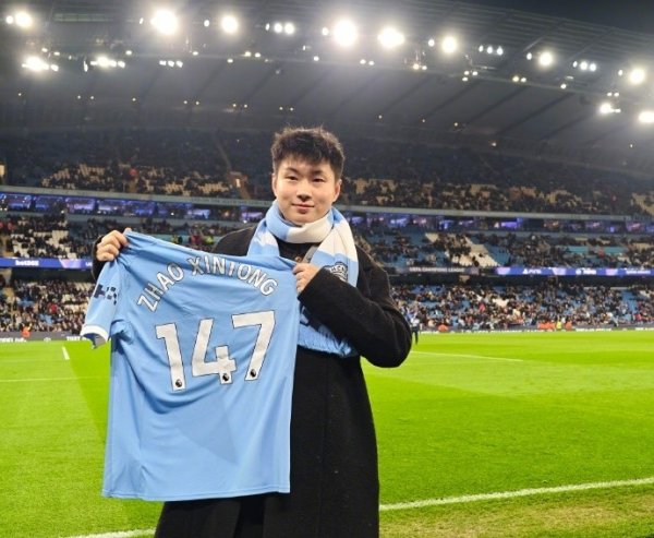赵心童走访曼城主场展示斯诺克世锦赛奖杯,并获赠147号球衣