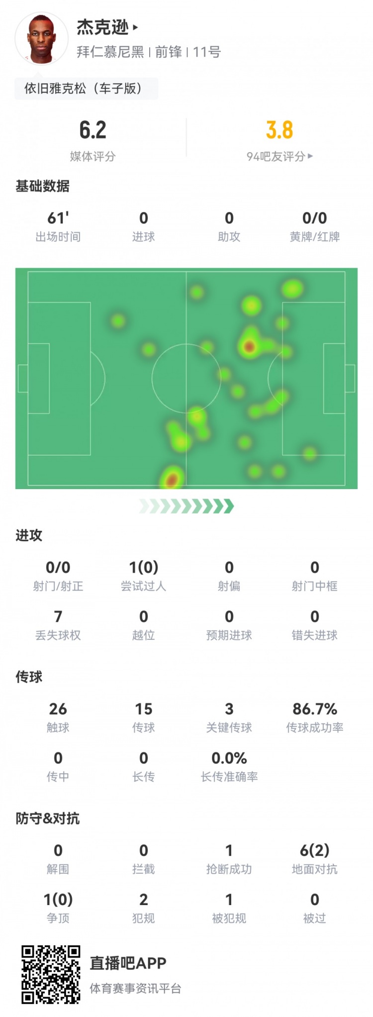 10月19日讯 本轮德甲焦点战,拜仁主场2-1多特。此役杰克逊首发61分钟被换下,球员全场重心数据如下↓