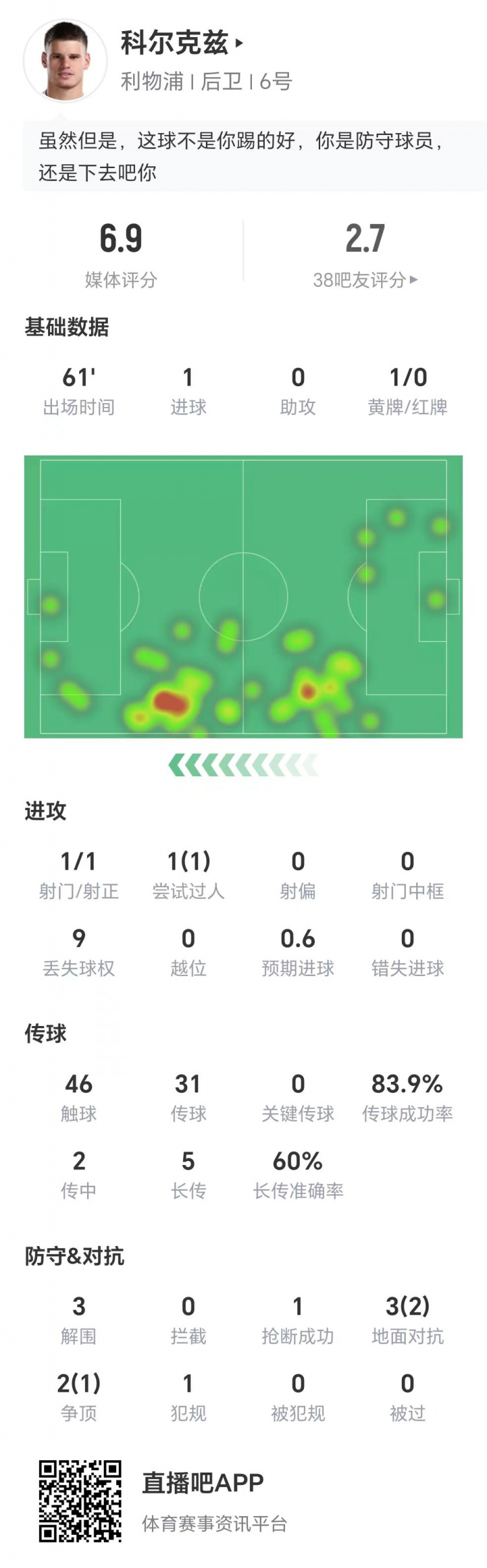 技艺统计数据清醒,科尔克兹本场比赛1射1正打进1球,零缺陷传球,5次传中见效用60%,3次突围,1次抢断,3次大地抗击见效两次,获评6.9分。