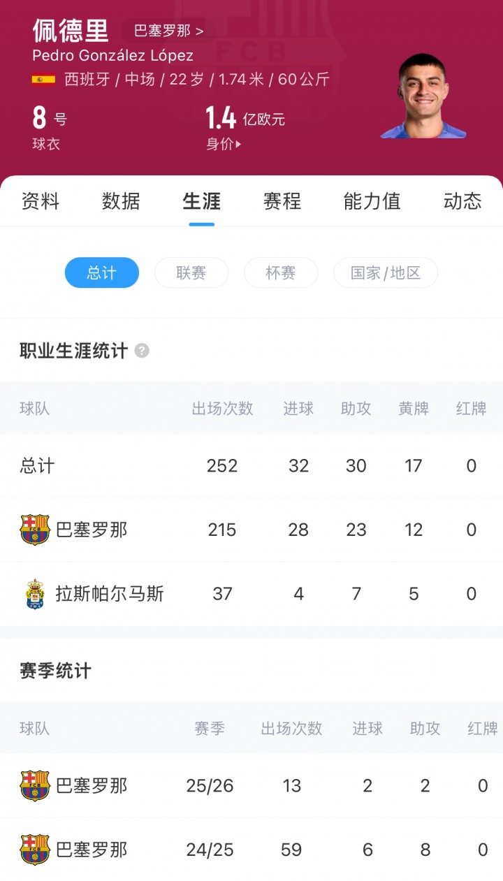 佩德里本赛季已为巴萨出战13场比赛,总出场时分1099分钟,而上个赛季佩德里为巴萨的出场次数达到了可怕的59场,计较4646分钟。