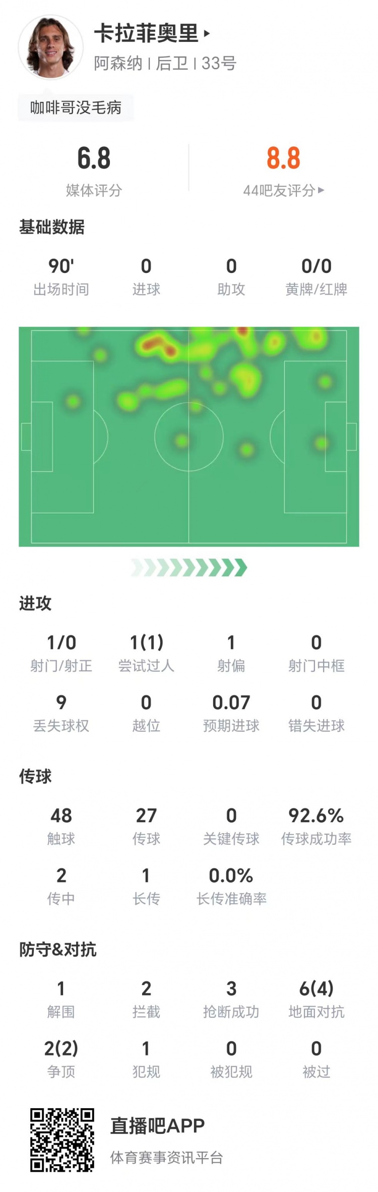 卡拉菲奥里全场数据:1次突围,两次阻止,3次抢断,获评6.8分