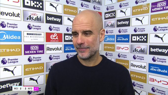 虎扑03月05日讯曼城球队教练瓜迪奥拉在2-2战平诺丁汉森林的赛后,接受TNTSport采访。