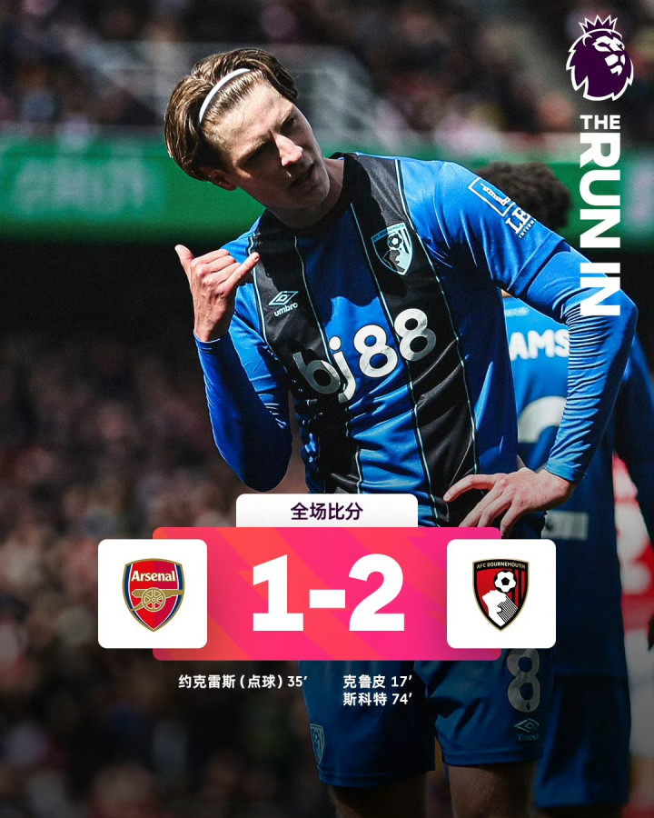 英超第32轮:1-2负伯恩茅斯。本·怀特再次错误 送礼,最终1-2告负。
