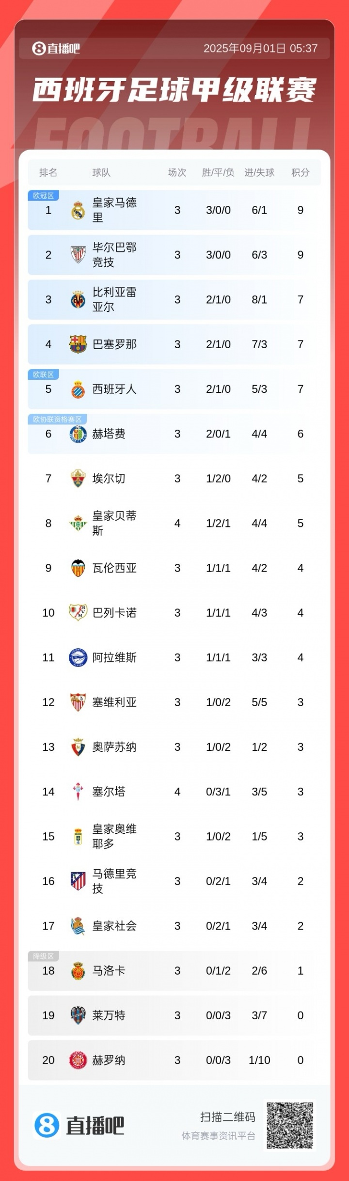 西甲积分榜:皇马、毕巴全胜分列前二,巴萨战平暂排第四